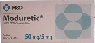 Moduretic is used for treating fluid retention (edema) and high blood pressure. It may be used alone or with other medicines. Moduretic is a diuretic (water pill) and is a combination of a potassium-sparing diuretic (amiloride) and a thiazide diuretic (hydrochlorothiazide). It works by making the kidneys eliminate sodium (salt) and water from the body, which helps to lower blood pressure. The amiloride component helps minimize potassium loss.